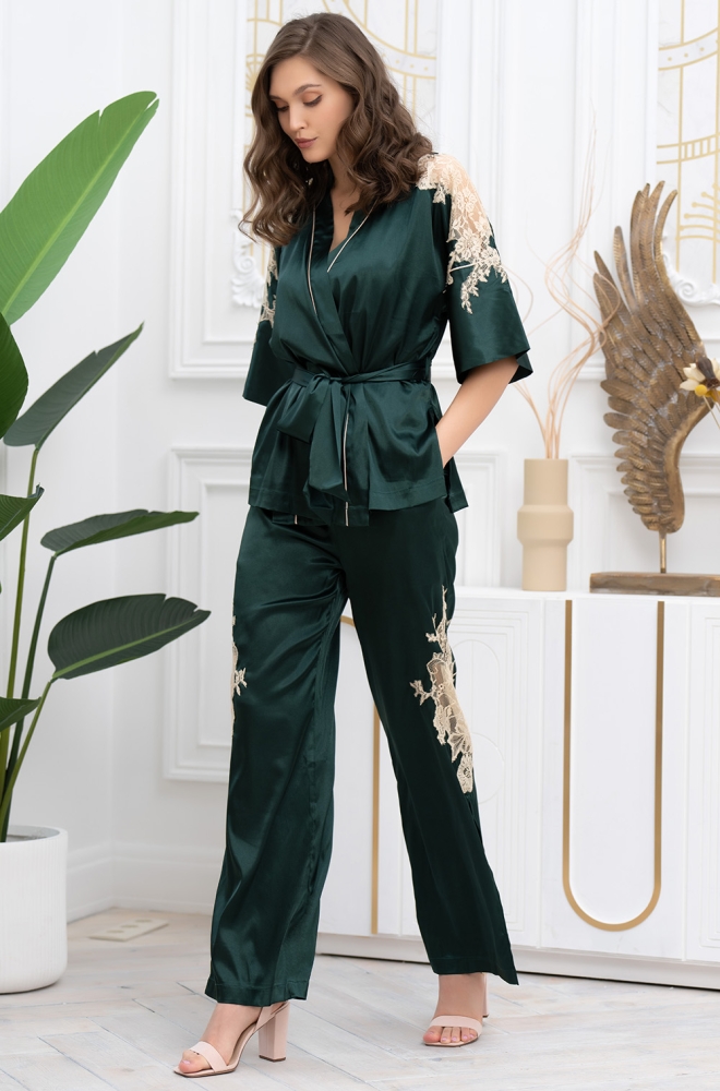 Комплект Mia-Amore состоит из топа, брюк и запашного жакета. Комплект выполнен из смесового шёлка. Топ на тонких бретелях и брюки декорированы ажурными вставками. По бокам брюк эффектные разрезы. Рукава жакета украшены кружевом и контрастным кантом. Жакет запахивается на широкий эффектный пояс.Состав: Состав: 70% натуральный шелк, 25% полиэстер, 5% эластан