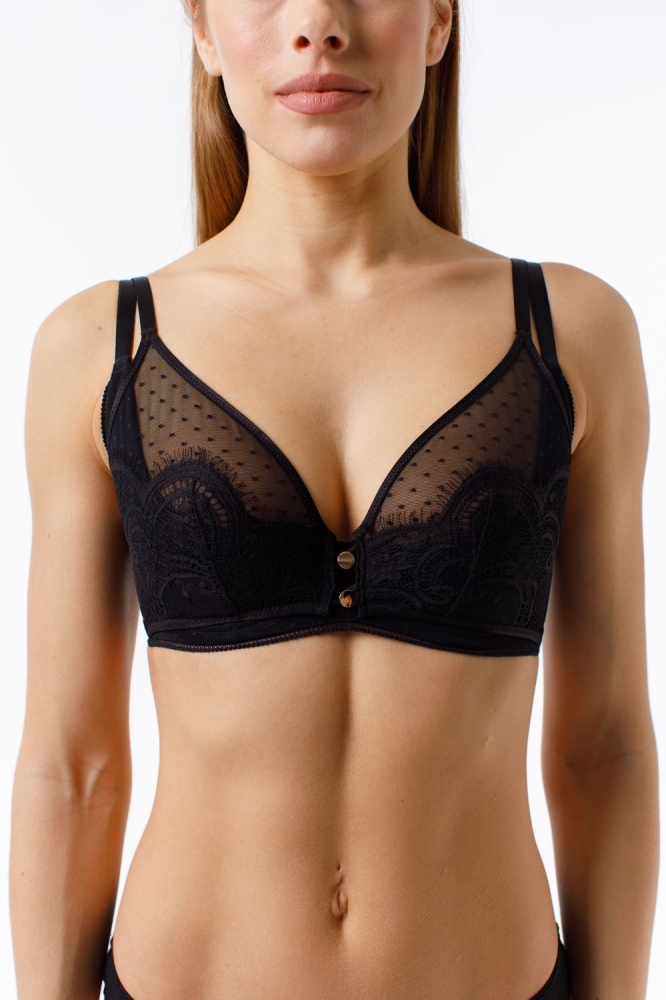 Бюстгальтер мягкая чашка состоит из двух деталей: нижняя выполнена из поролона обтянутого эластичной сеткой, верхняя из эластичной сетки и эластичного кружева, На деталях верхней чашки располагаются петли, при помощи которых чашку можно растегнуть .Украшение металлические пуговицы к которым при желании можно пристегнуть чокер.Состав: 85% ПОЛИАМИД/ 15% ЭЛАСТАН