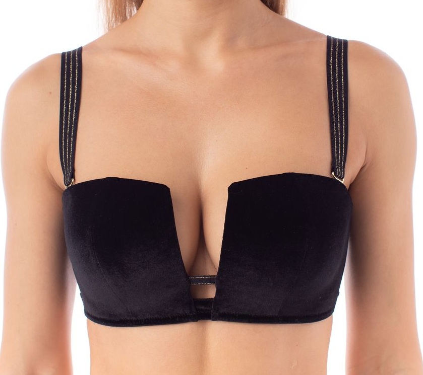 Бюстгальтер-бандо без каркасов, изготовлен из бархатистого полотна в сочетании с золотой нитью и прозрачной вуалью. Бюстгальтер необыкновенно соблазнительный, мягкий и уютный, но в то же время "дерзкий". Идеальное декольте возможно и со съемными бретелями. На стане вертикальные, корректирующие пластины.Состав: 85%- полиамид; 15%-эластан;