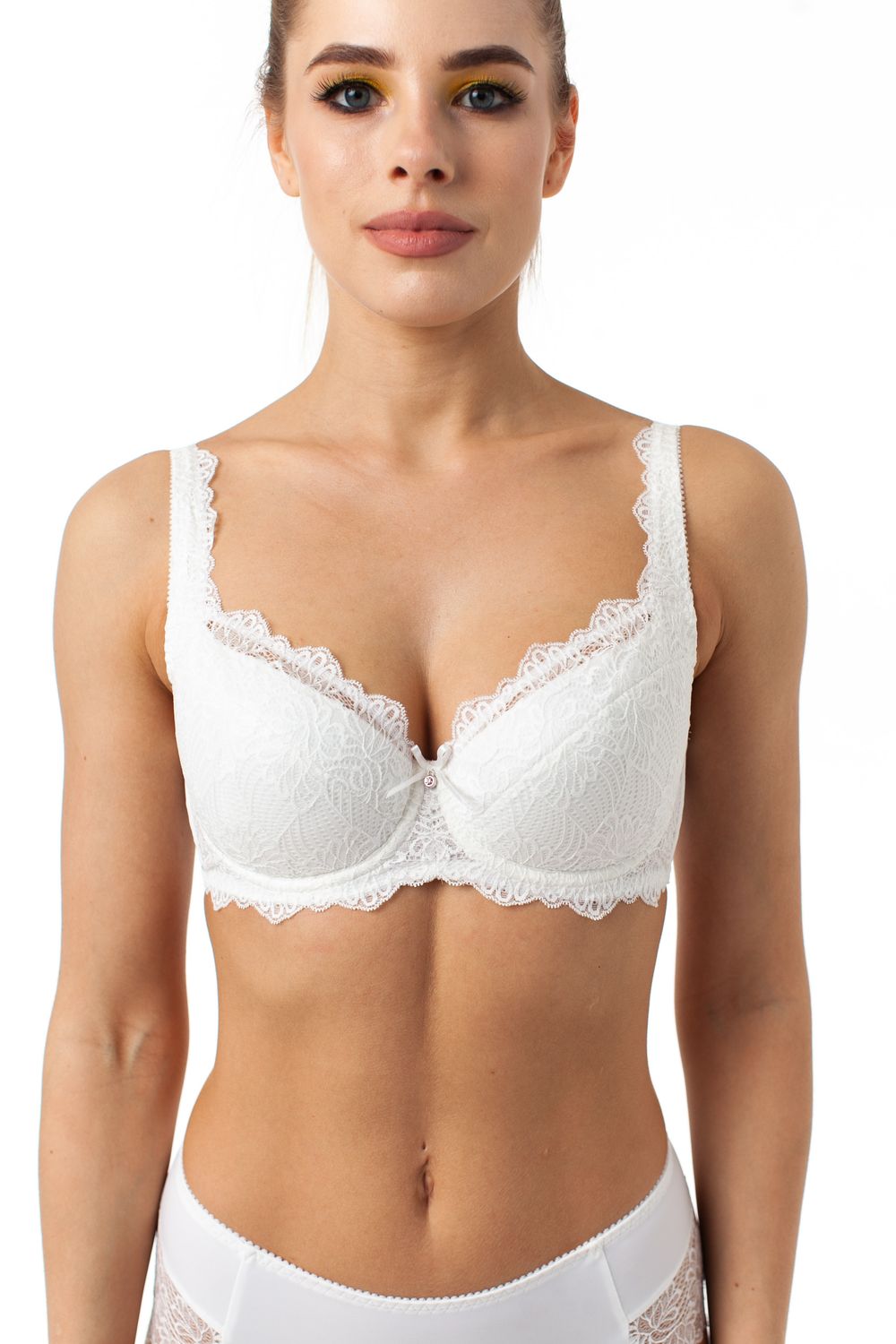Бюстгальтер на поролоне, на каркасах. Выполнен из эластичного кружева и эластичного полотна. Кружевные детали укреплены в основании бретелей и обеспечивают дополнительную поддержку груди. На стане бюстгальтера вертикальные упругие, корректирующие пластины, позволяющие прилегать к телу и не скручиваться боковой части бюстгальтера. Украшение: атласный бантик с подвеской из стразСостав: 70% ПОЛИАМИД 20% ЭЛАСТАН 10% ХЛОПОК