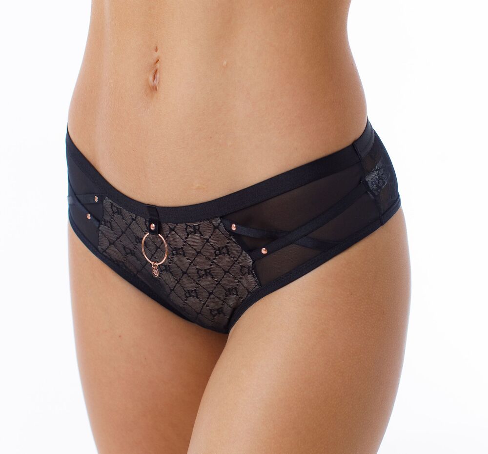 Трусы-бразилиана со средней линией талии, выполнены из эластичной сетки с геометрическим рисунком и логотипом CR. Украшение: декоративное кольцо с медальоном COQUETTE REVUE.Состав: 85% ПОЛИАМИД/ 10% ЭЛАСТАН/ 5% ХЛОПОК