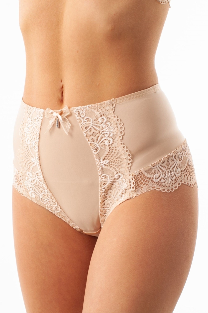 Трусы слип с высокой линией талии, Передняя и задняя детали выполнены из эластичного полотна и эластичного кружева, с лёгким утягивающим эффектом. Украшение: бантик с подвеской из трех страз.Состав: полиамид 80%. эластан 15% хлопок 5%