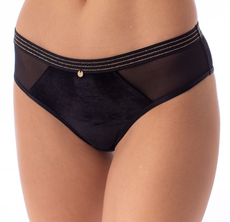 Трусы-бразилиана со средней линией талии,выполнены из бархатистого эластичного материала, тонкой вуали и золотой нити. Украшение - металлический золотой медальон с логотипом COQUETTE REVUE.Состав: 85% ПОЛИАМИД/ 10% ЭЛАСТАН/ 5% ХЛОПОК