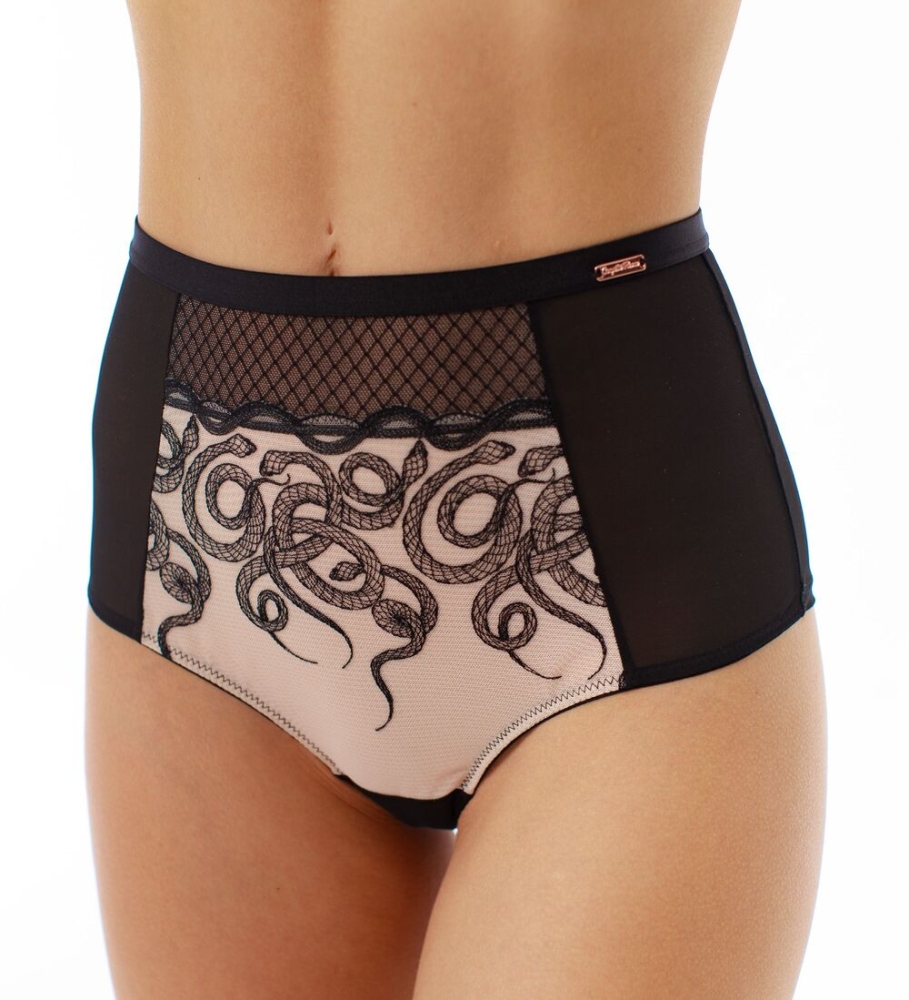 Трусы-макси с высокой линией талии. Выполнены из эластичной сетки и сетки с декоративной вышивкой в виде змеи. Украшение: медальон COQUETTE REVUE и кольцо в виде змеи.Состав: 85% ПОЛИАМИД/ 10% ЭЛАСТАН/ 5% ХЛОПОК